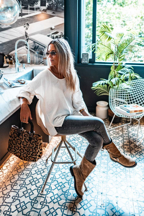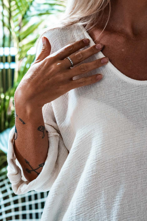Notre mannequin porte une taille unique pour son 34 / 36 habituel et mesure 170 cm