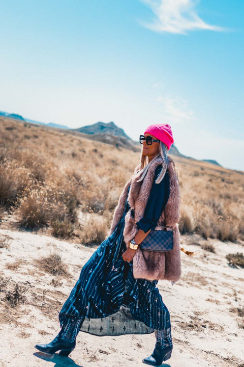 Nathalie porte une taille unique pour son XS / S habituel et mesure 168 cm