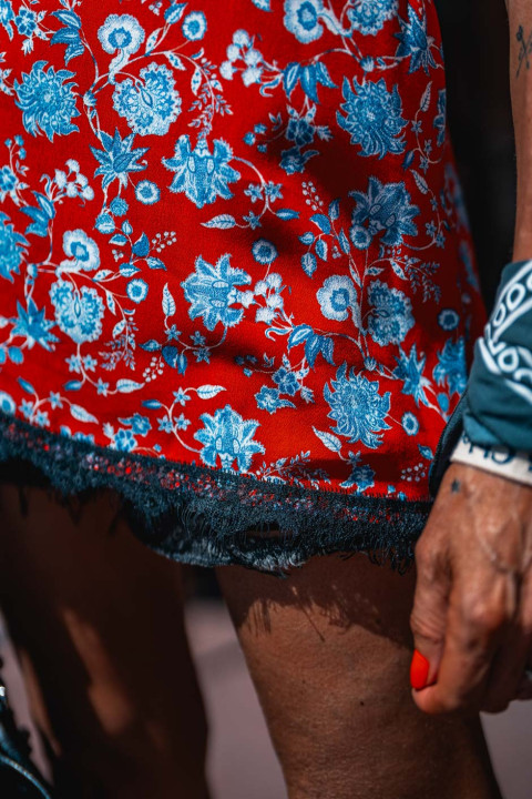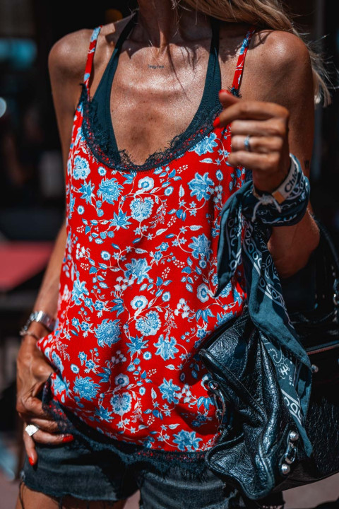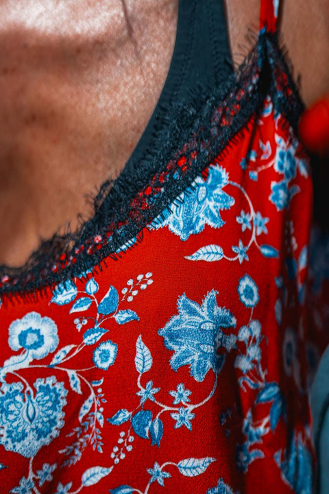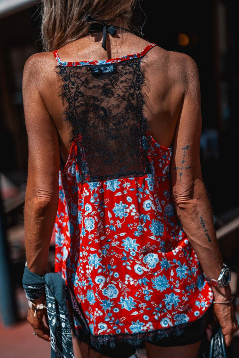 - Imprimé fleuri sur fond rouge d’une beauté envoûtante